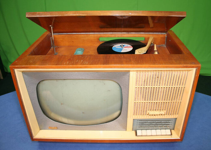 Более интересен телевизор, точнее не телевизор, а телерадиола - это своеобразный "мультимедийный" центр образца середины 20-го века. В одном корпусе размещены: телевизор, радиоприемник и проигрыватель пластинок. Телерадиола "Беларусь-110" с 1963 года выпускалась на Минском радиозаводе, стоимость устройства составляла 432 рубля 18 копеек.
