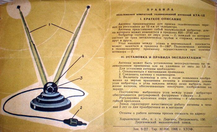 На телевизоре стоит комнатная телевизионная антенна "КТА-1Д", которая выпускалась предположительно с 1966 года Дергачёвским механическим заводом. Стоила такая антенна 4 рубля 50 копеек.