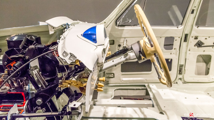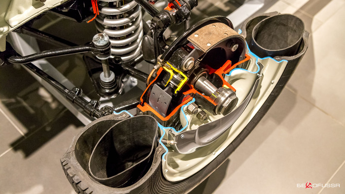 Колёса левой стороны сделаны в разрезе, прозрачными. Устройство тормозов и шин – всё наглядно показано.