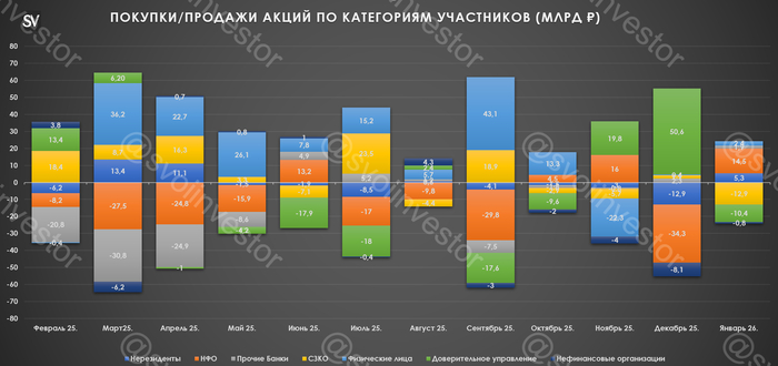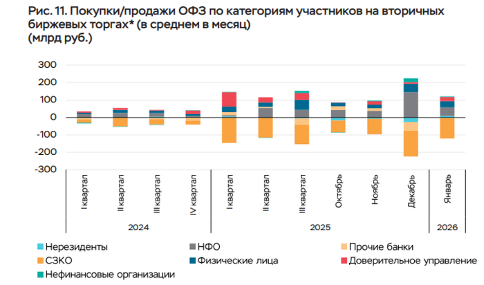 ✔️ Согласно статистике ЦБ, в декабре-январе основными покупателями ОФЗ на вторичном рынке стали НФО — в декабре 144,6₽ млрд и январе 50,3₽ млрд (ноябрь — 40,3₽ млрд), физические лица нарастили свой аппетит на покупки в январе — 34,2₽ млрд. Крупнейшими продавцами стали вновь СЗКО — в декабре 147₽ млрд и январе 115₽ млрд (в ноябре — 89,4₽ млрд). На первичном рынке крупнейшими покупателями стали СЗКО, выкупив 54% размещений в декабре и 37% в январе. В январе на вторичном биржевом рынке ОФЗ, среднедневной объём торгов ОФЗ снизился по сравнению с декабрём с 51₽ млрд до 37₽ млрд.