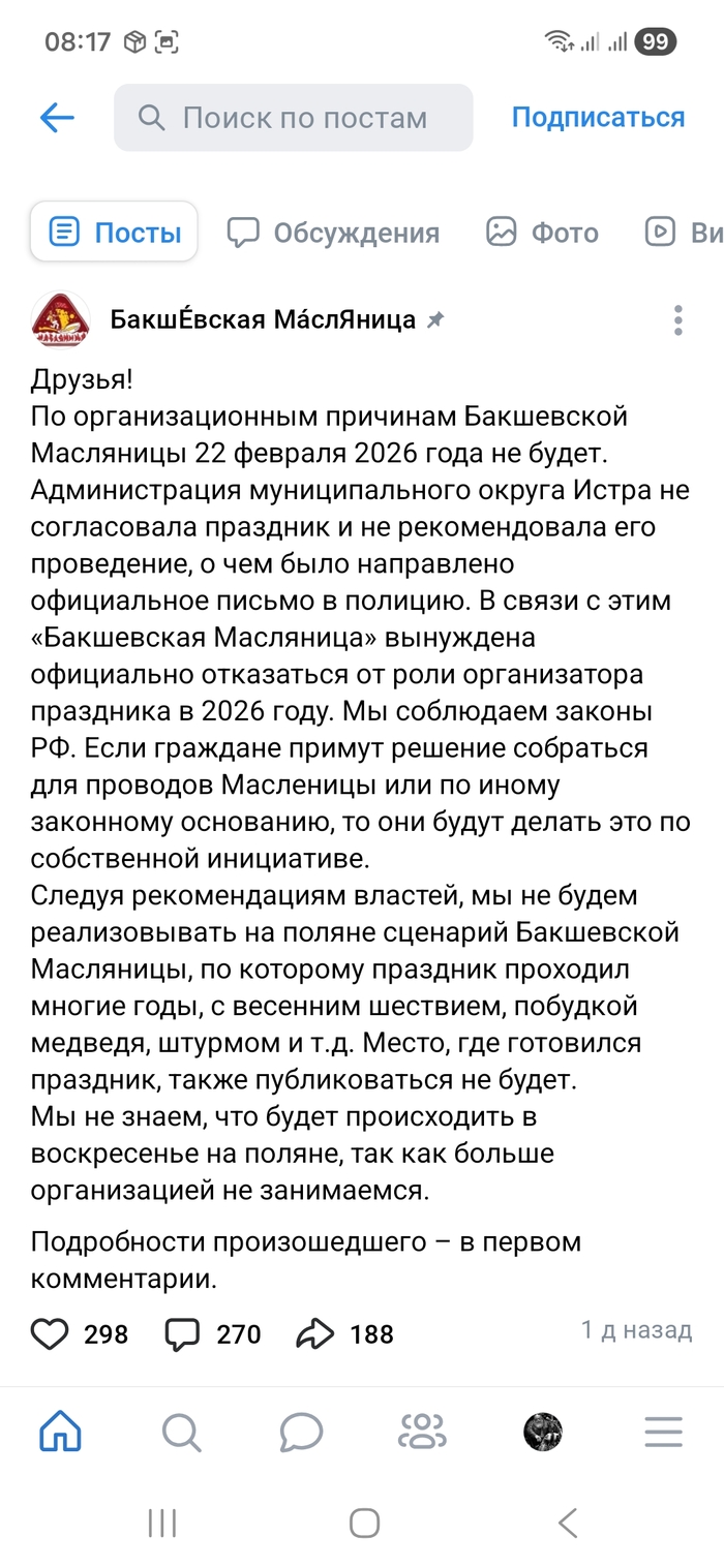 📌 Сейчас в информационном пространстве активно обсуждается отмена Бакшевской масленицы, которую планировалось провести на территории муниципального округа Истра.