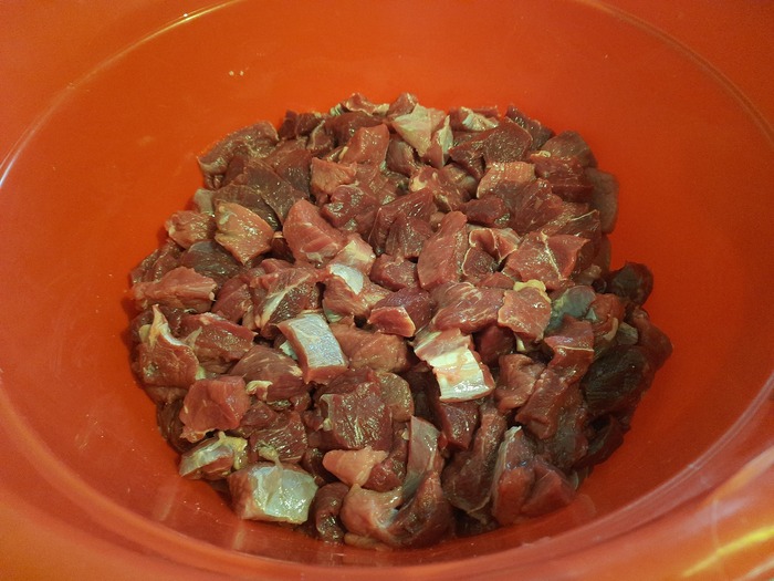 Нарезаем мясо на кусочки по 3-5 см