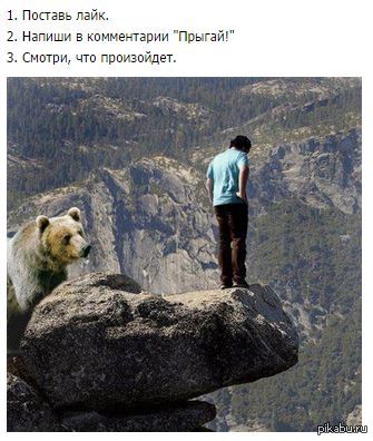 sxlvn Прыгай! Или что произойдет... 11 лет назад В пабликах всеми известной соцсети я стал часто натыкаться на данный пост, но продолжения найти мне так и не удалось, помогите раскрыть тайну! Прыжок Медведи Человек Скалы