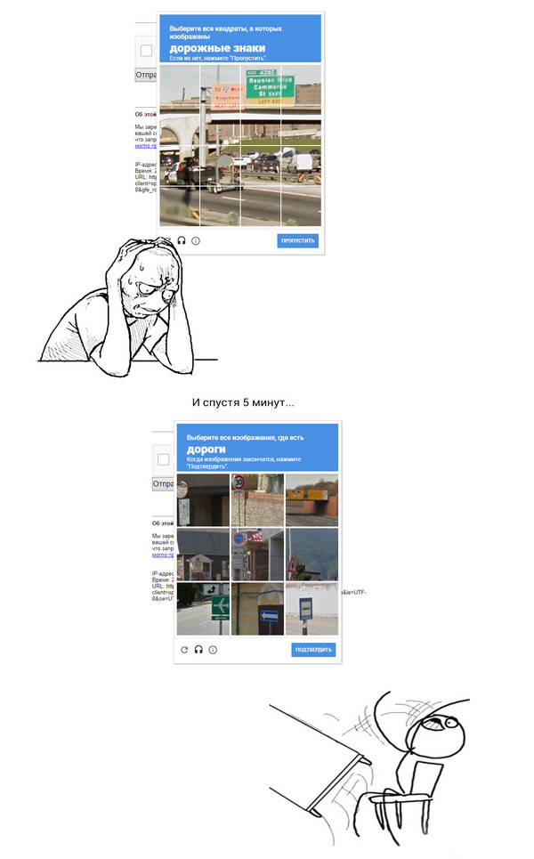 В дело вступает recaptcha v2.0. Мало того, что надо нажать на галочку (что вроде бы просто), спустя время вылазят вот такие изображения, по которым можно тыкать вечно. Когда вы наконец разгадали картинку, вам могут дать... ...следующую.