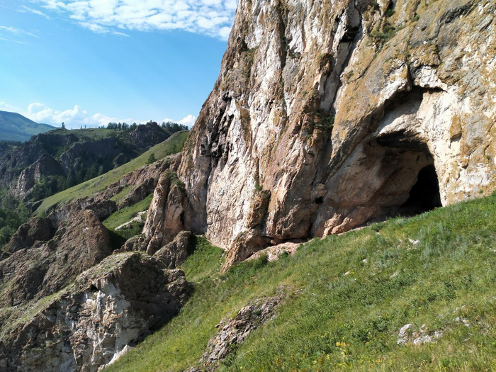 Сразу после вас встретит Большая Тохзасская пещера. Именно здесь нашли останки древних людей и животных, а также, рисунки охрой. Мы рисунки не нашли, так как грот большой, а у нас из освещения было только 2 фонарика на телефонах, этого достаточно, чтобы ориентироваться, но не достаточно, чтобы искать петроглифы (зато вандализм виден прекрасно, но об этом позже)