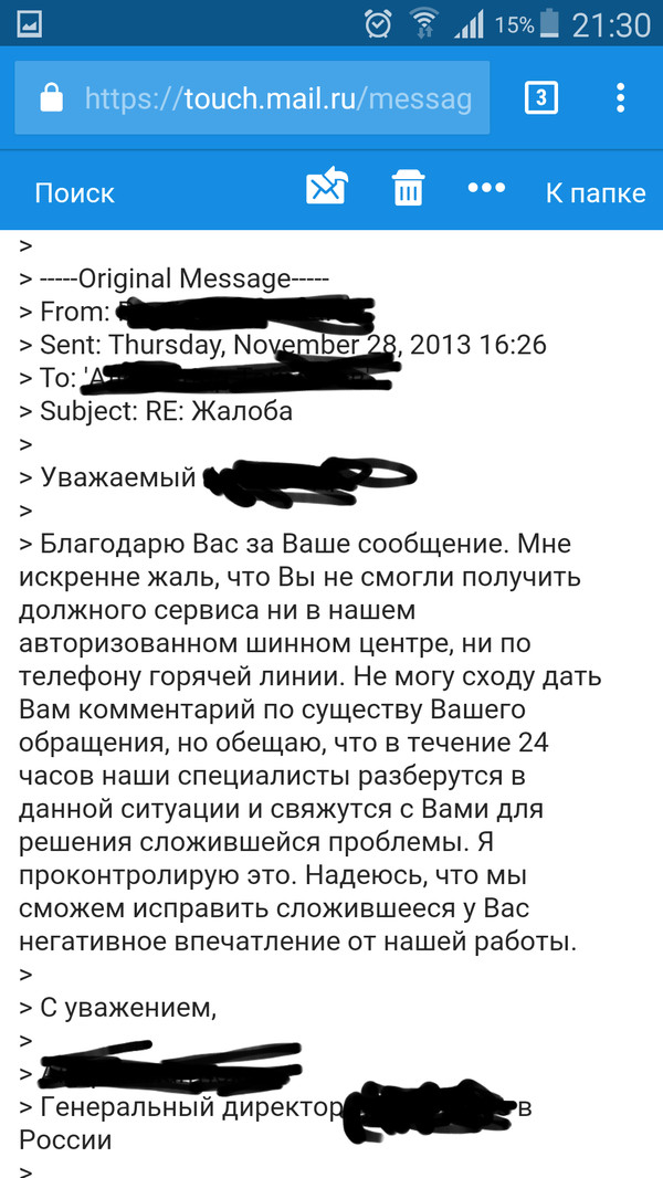 На волне, как говорится. Про расширенную гарантию на шины, которую сейчас дают многие производители. Три года назад было дело, вся история в скринах переписки. Все решалось несколько недель, но решилось менее, чем за сутки, лишь когда я написал уже крик души в копию на адрес Самого Главного в компании в России. А адрес его я придумал, почитав в интернетах, как его зовут, и посмотрев среди других корпоративных адресов компании, которые есть в свободном доступе, по какой маске они присваиваются. (Имя.фамилия@домен.ру и @домен.ком)