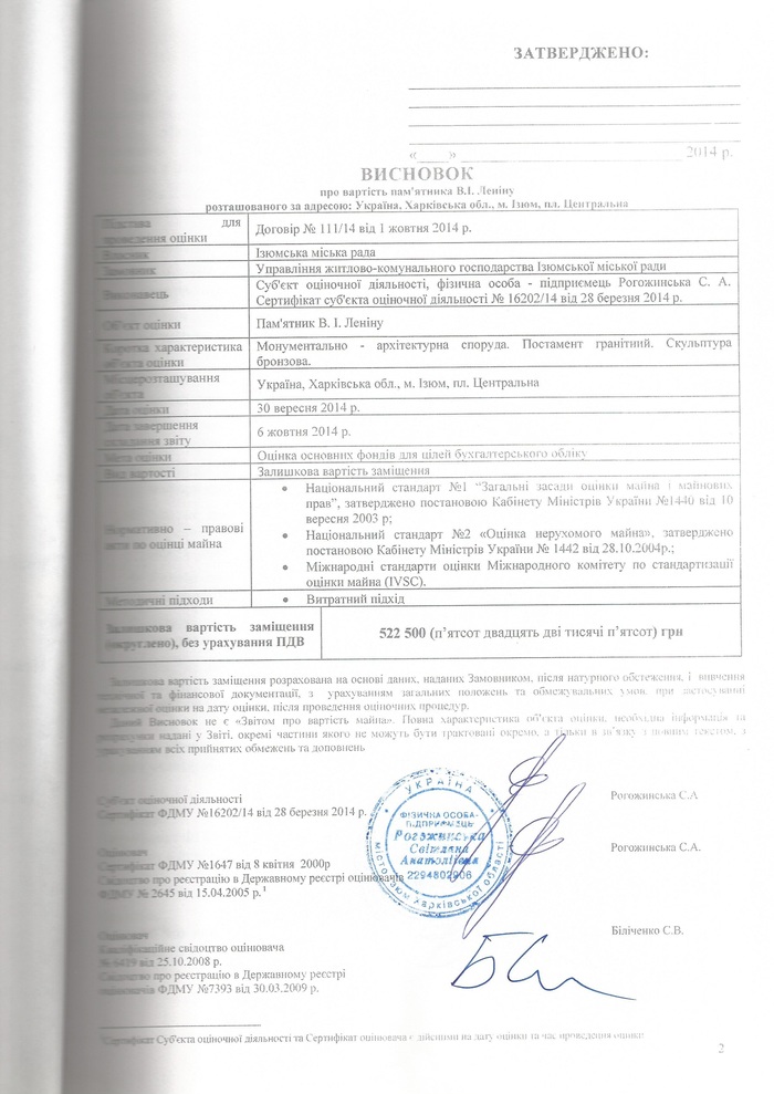 Перевод: "Бывший памятник В.И. Ленину, который находится в демонтированном состоянии. Скульптура пустотелый, отлитая из бронзы творческим объединением "Художник" г. Киев. Высота скульптуры в полный рост - 3,75 м. Надпись на памятнике отсутствует. Ориентировочный вес - 1500 кг."