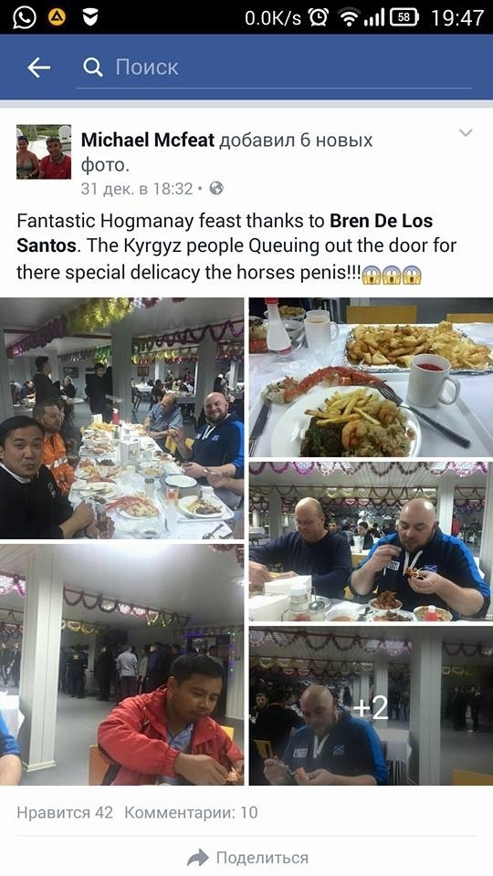 "Фантастический канун Нового года благдаря Брен де лос Сантосу (еще один работник "Кумтора" - Zanoza). Кыргызы выстроились в очередь даже за дверью за особым местным деликатесом - конскими пенисами"