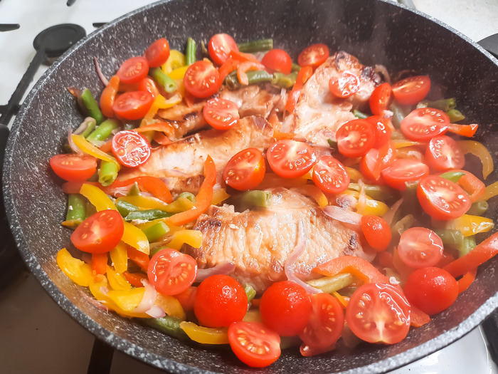 Теперь нужно добавить консервированные томаты. Если взять итальянские, то они бывают в банках или картонных коробочках уже нарезанные. Можно взять целые и размять лопаткой, главное, чтобы они были без шкурки, а то потом выковыривать шкурки будет то ещё удовольствие.
