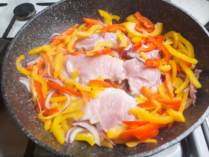 Теперь нужно добавить фарш и обжарить все вместе ещё 5-7 минут. Вот тут есть один важный момент: на этом этапе обязательно очень тщательно размять лопаткой все комки. Потом это будет гораздо труднее сделать.
