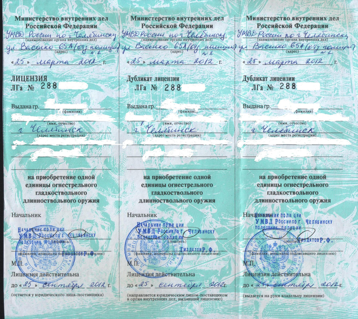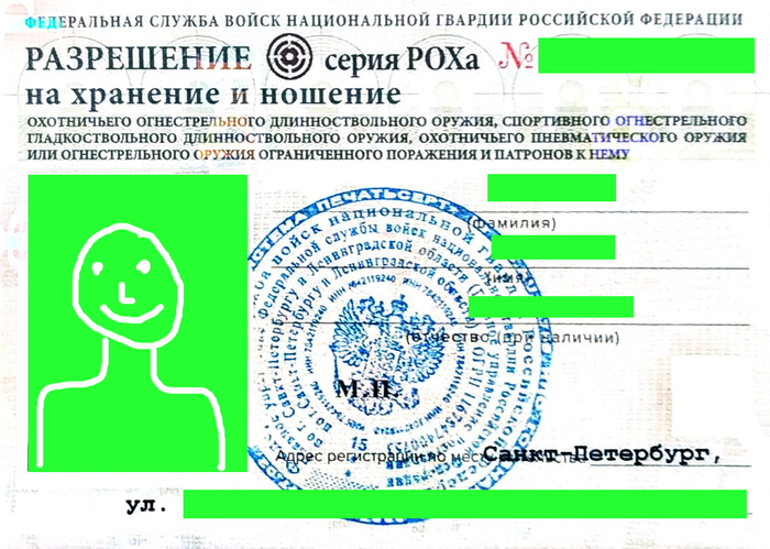 6) Со всем ворохом макулатуры подаем заявление на Госуслугах на выдачу лицензии на покупку охотничьего гладкоствольного огнестрельного оружия. Цель покупки выбирайте охота, даже если будет дома стоять в сейфе пять лет. Оружие самообороны нельяз в принципе выносить из дома, оружие для спорта можно использовать только на спортивных объектах. Пошлина на госуслугу составляет 2000 рублей (1400 со скидкой 30% при оплате через сайт). Срок у Росгвардии на выдачу лицензии 30 дней. Теоретически, они как-то должны проверить условия хранения будущего оружия. Возможно, в маленьких городах они даже приходят. В Питере с этим напряги. Если никто не проверил - это не твоя проблема, а их обязанность, так что париться не надо. Мне уже через две недели пришло уведомление, что услуга предоставлена и надо явиться в районную запретиловку со всеми бумагами. Я еще прихватил с собой доки на сейф, потому что формальный акт осмотра места хранения росгвардейцу составить все-таки надо. Приходим, получаем лицензию на покупку оружия.