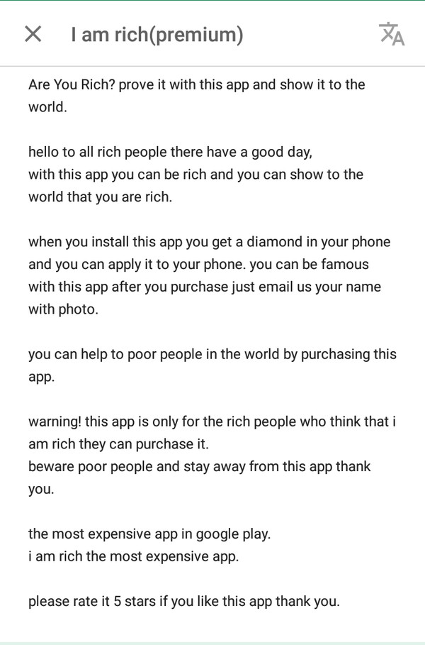 По сути описания можно понять, что это приложение ничего не даёт, просто можно хвастаться друзьям тем, что у тебя есть самое дорогое приложение в GooglePlay, ну и ещё отослав фотку и имя админам они их разместят в приложении.