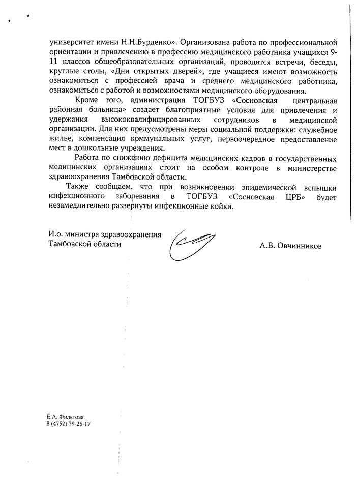 Сосновская ЦРБ Тамбовской области укомплектована врачами на 59%. Инфекционное отделение не работает с начала года, потому что нет врачей. Родильное отделение ликвидировано несколько лет назад. Программа государственных гарантий бесплатного оказания населению Тамбовской области медицинской помощи не выполняется. МРТ пришлось ждать более месяца, вместо положенных 14 рабочих дней (согласно программе гарантий по Тамбовской области). Массажа пришлось ждать 2 недели. Уколы выписали спустя почти 3 месяца. Весь процесс проходил С 9 августа По 20 октября.