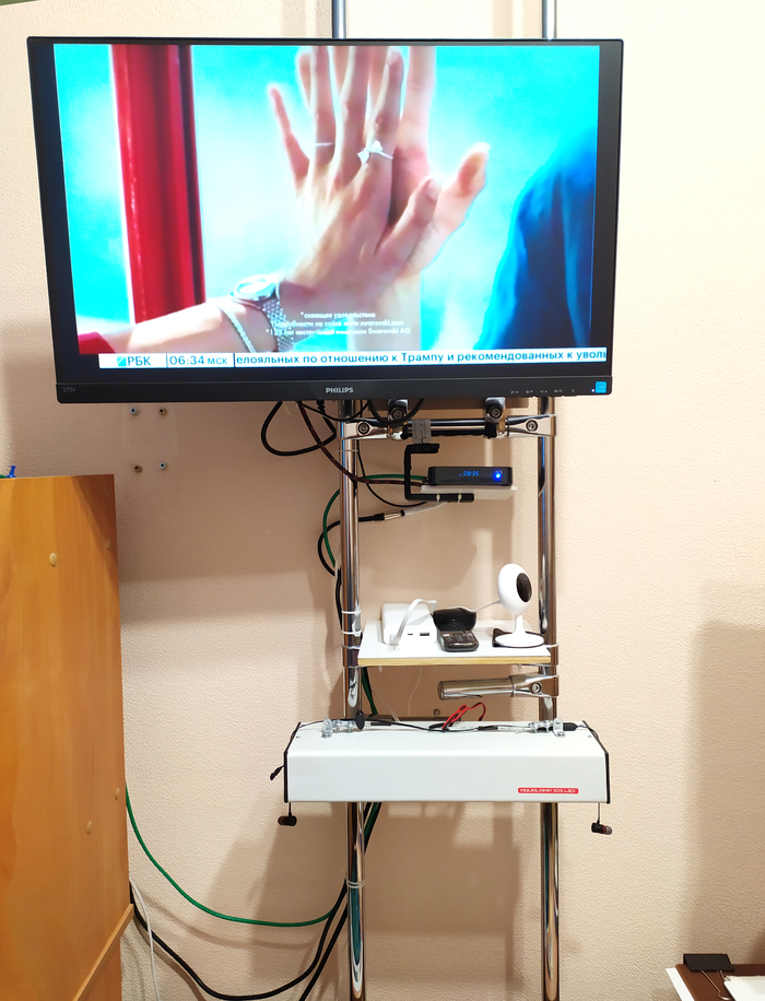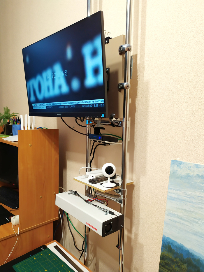 Почему сделал именно так: комната не большая и хотелось унифицировать некоторые вещи в одно место и тумба или шкаф был бы по этому не вариант, на данную конструкцию можно добавлять и полки и просто подвешивать разные элементы например тв бокс или медиаплеер или роутер, да да-же цифровые усилители сейчас это не большие "коробочки" так что и это можно, а так же многое другое, например то что там на сейчас у меня.