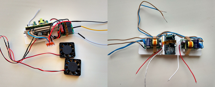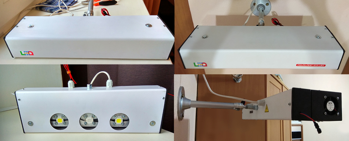И так, одновременно с обдумыванием идеи светильника я определился с нужными компонентами которые нужно заказать из китая и постепенно стал их заказывать- сначала все самое первоочередное, кронштейн в последнюю очередь. И так вот, что мной было заказано из электро-начинки: светодиоды белые на 10W и драйвера к ним, взял с запасом по 4шт., 1 rgb светодиод 10W, rgb контроллер от прожектора- для него (идет с пультом, в котором много возможностей по управлению rgb диодом), переключатель на 2 канала (обычно используется для люстр, так же идет с пультом) с помощью его можно будет включать и выключать белые диоды в любых вариациях, также на 1 из каналов "повешены" вентиляторы- собственно их то-же покупал там. Покупал импульсный БП на 12в 1.5А для питания вентиляторов и выхода на 12в из светильника для питания например компрессора, помпы или еще мало-ли чего из аква-хозяйства. Напряжение на вентиляторах, чтоб излишне не шумели, регулируется с помощью понижающего модуля, который так-же был добавлен в корзину. Здесь на фото все эл. компоненты (кроме понижающего преобразователя, хотя где на фото правее уже 2 модуля в сборе он есть) А так же все эти компоненты собраны в 2 модуля- левый и правый, зачем так сделано, далее станет ясно.