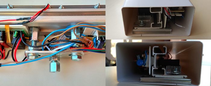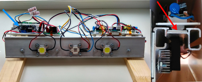И да, красной стрелкой показано место и как крепятся эти 2 модуля к раме- это можно сказать салазочная конструкция, я их больше даже ничем не доукреплял держатся хорошо, они висят на раме за счет паза, а держит их полоска того же пластика вдетая в паз в алюминиевой рамы. Синей стрелкой показан понижающий модуль.