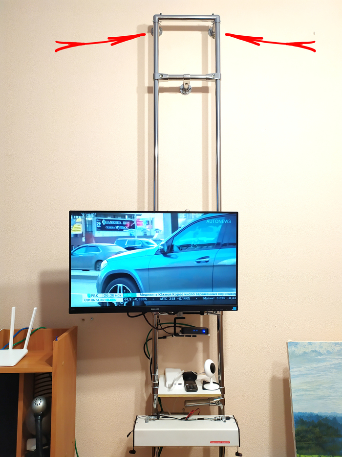 Еще есть очень важная деталь почему сделал такую конструкцию: не хотелось крепить телефизор к самой стене, так как во первых стена тонкая и сверлить ее раз за разом не хочется. Поэтому продумал крепление всей этой конструкции так, что она вся держится в прямом смысле на двух мощных дюпелях которые находятся в самом верху (места показаны красными стрелками). В этом месте ближе к потолку с обратной стороны стены по всей ее длинне что-то вроде бетонной балки большой толщины. Все остальные крепления конструкции, а их всего 2, то они просто на коротких шурупах и служат для того что-бы придать жесткость самой конструкции, ну и соответственно к полу в двух местах так же на простые шурупы.
