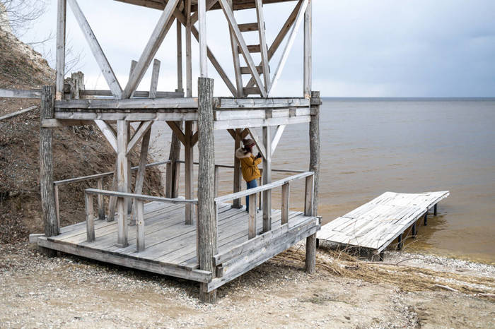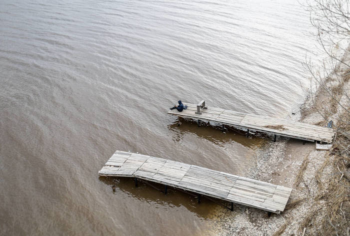 На берегу поселка два причала, с одного из которых местный житель удит рыбу. У основания деревянного сооружения — остатки хлипкой лодочки и несколько больших бревен — опять узнаю реквизит сериала.