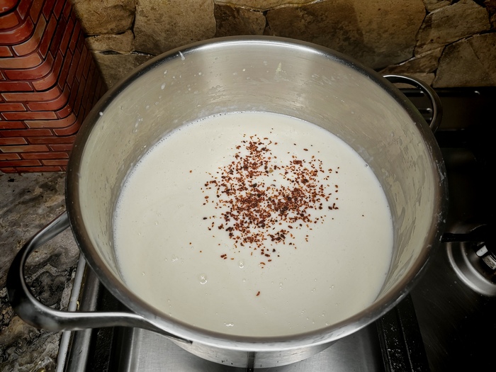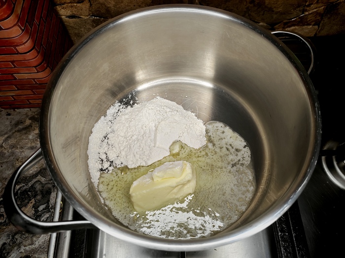13. Приступаем к бешамелю. Небольшую кастрюлю на сильный огонь, в кастрюлю сливочное масло и муку. Перемешиваем, видим, что оно начало жариться.