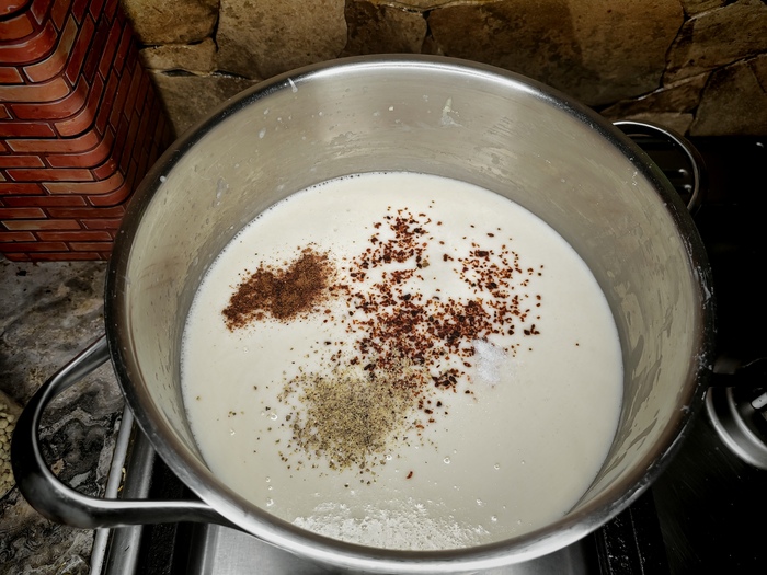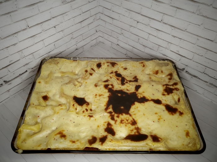 25. Достаём жаровню, скрываем с неё всё покровы (фольговые), включаем гриль на духовке и засовываем под этот гриль жаровню - пусть бешамель "схватится".