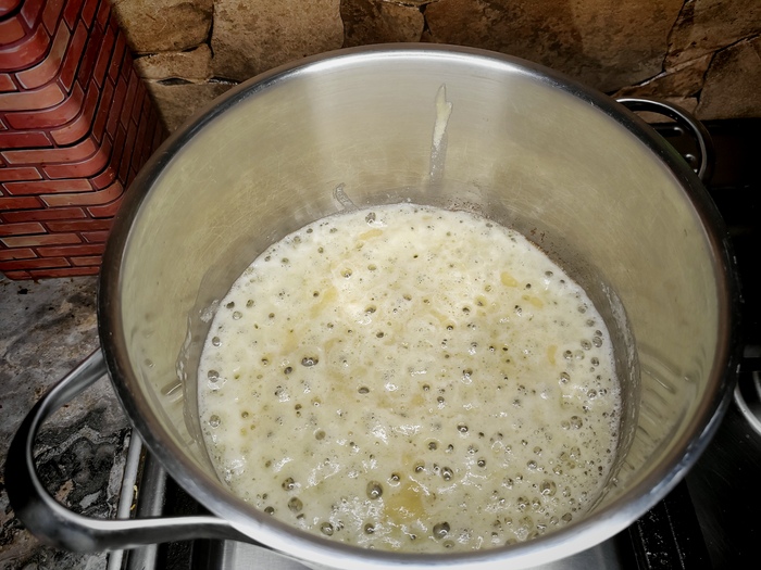 11. Смотрим, что там наварилось. Мясо должно стать почти тушёнкой, а вся жыжа должна почти выпариться. Выливаем сидр в месиво (можно и в себя немного), увеличиваем огонь, даём закипеть, убавляем огонь до среднего и снова накрываем крышкой. Пусть оно ещё тогоэтого.
