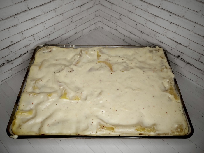 23. На последний слой листов рагу не выкладываем. Его мы мощно так заливаем бешамелем, который, на этот раз, разравниваем.