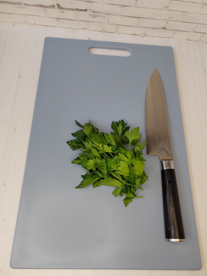 3. Лук, стебли сельдерея и чеснок режем ножом. Каждый овощ в отдельную миску. Чеснок в небольшой соусник и туда же немного оливкового масла.