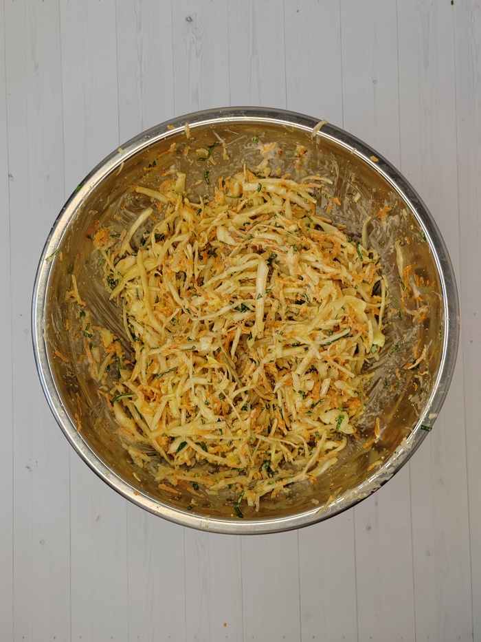 2. Переложим это вот всё в миску, посолим, поперчим и хорошенько промнём.