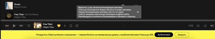 Пользователи Яндекс Музыкой с подключенным Яндекс Плюс и с блокировщиком рекламы видят вот такое милое предупреждение:
