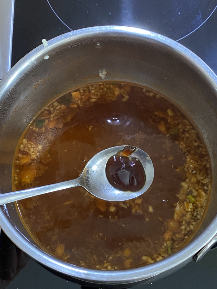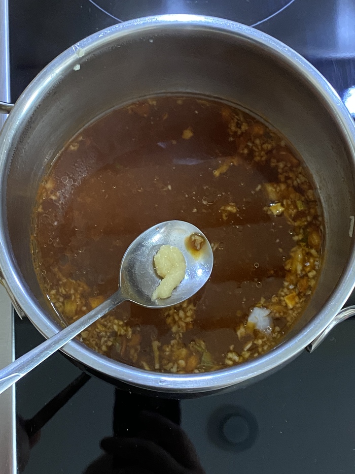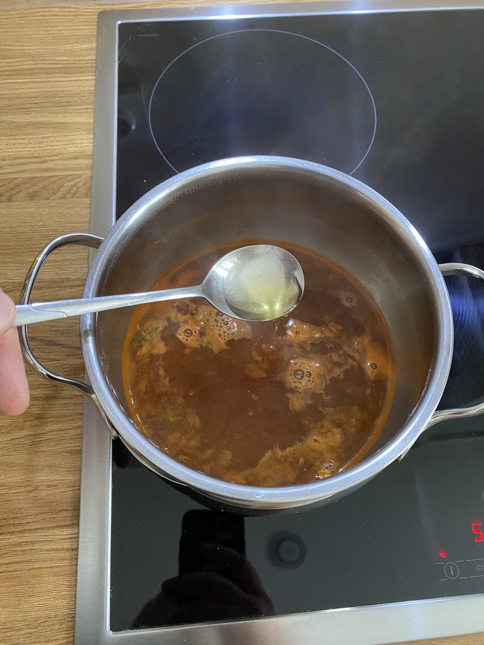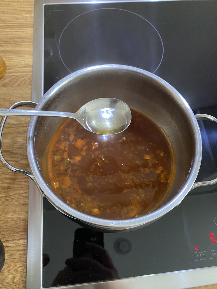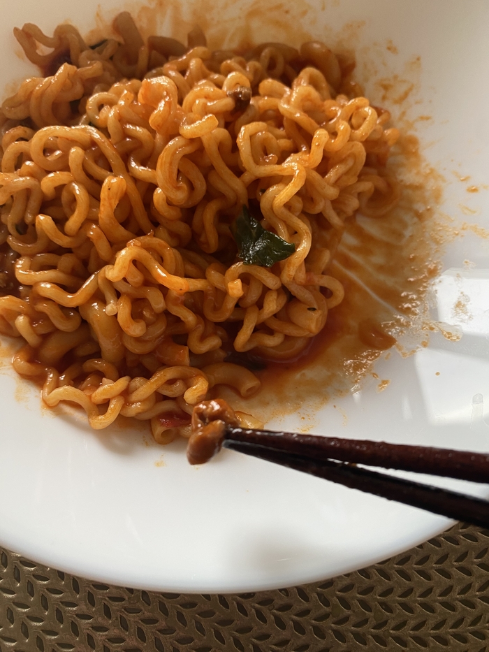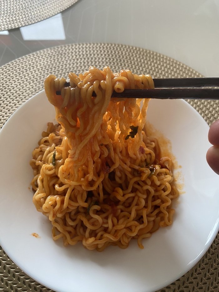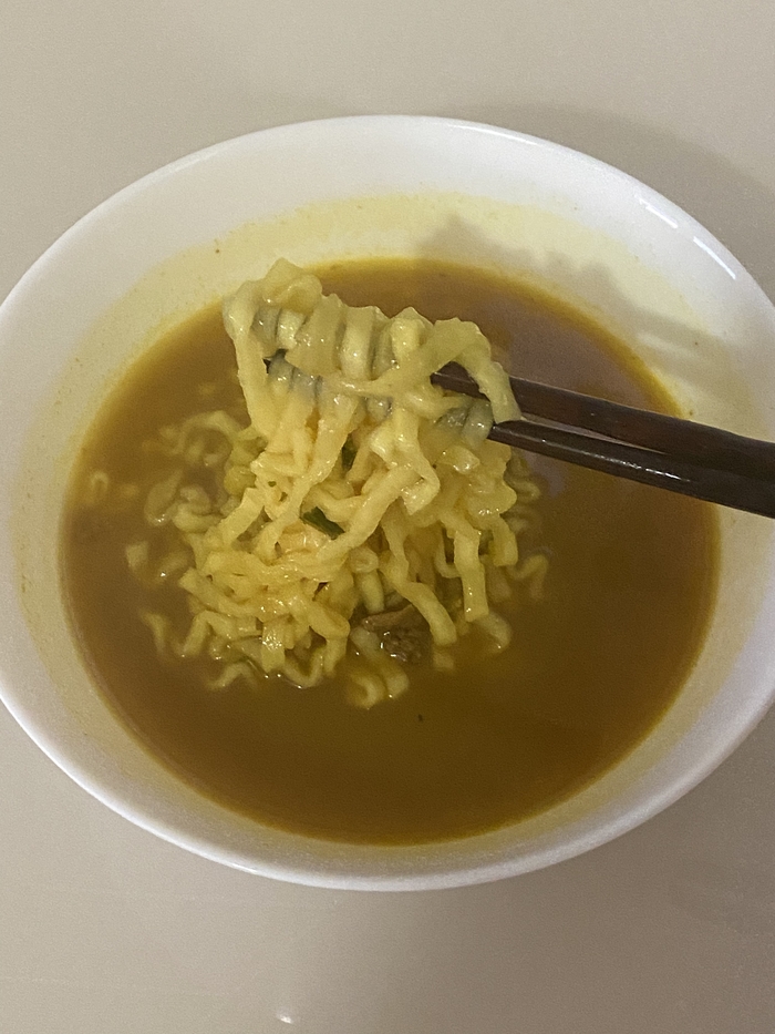 Аромат у этой лапши густой и очень насыщенный. Запах карри буквально въедается в рецепторы, даже как-то страшно пробовать. Бульон получился очень насыщенным, вязким и ядреным. Попробовав всего пару ложек этого варева, я понял две вещи. Первое - доедать я точно не стану и второе - я не люблю карри. Раньше как-то ел, ходил пару раз в популярный в прошлые годы, ресторан Тадж-Махал где повара были сплошь индусы. На объекте где работаю шеф-повар, долгое время был индус, так что карри в меню бывало часто. В общем ел я его, не фанател, но ел. Сейчас наверное, что-то поменялось и я понимаю, что больше точно не стану это есть. Лапша сама по себе не плохая, но этот вкус, он слишком сильный и приторный. Острый, но какой-то неприятный. В общем…