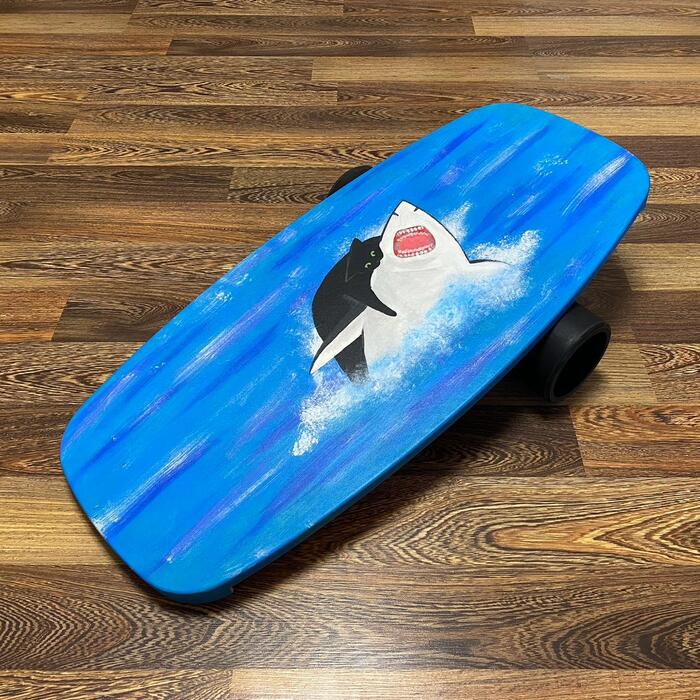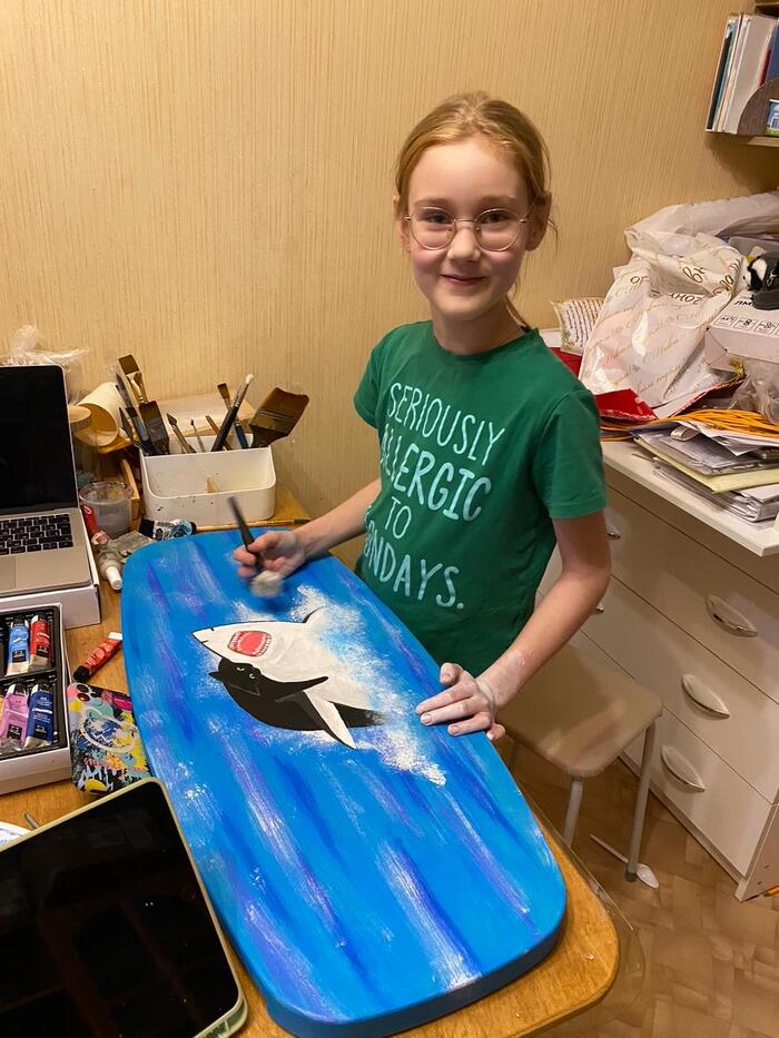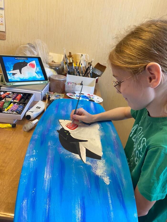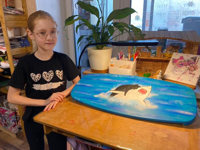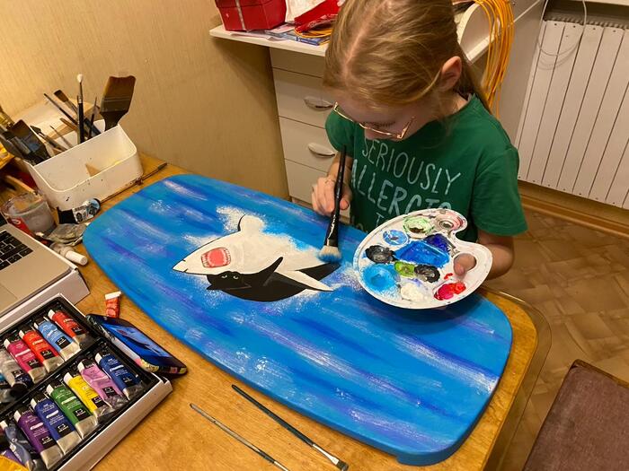 На каникулах у Оли было время и желание подзаработать, и как раз оставался давно не выполненным заказ на борд с котиком и акулой.