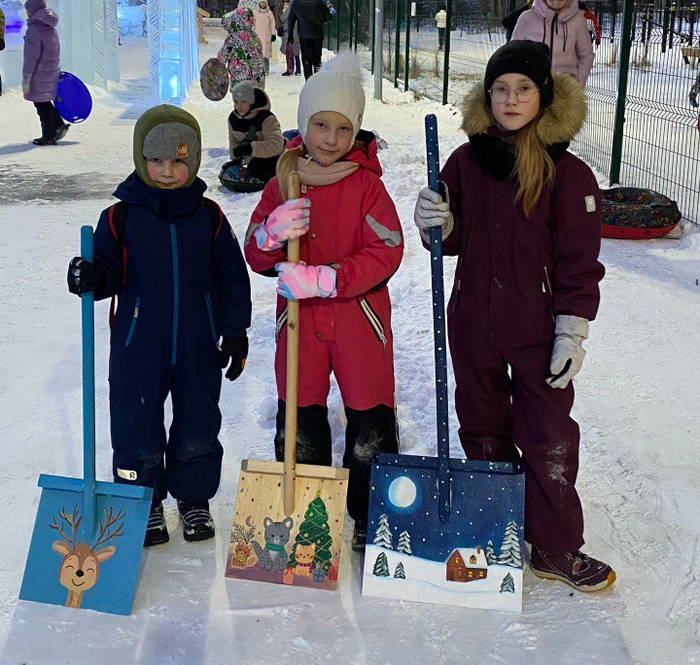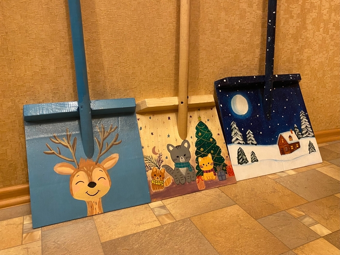 Но им просто лопат оказалось недостаточно, захотелось их сделать особенными. Ещё один вечер ушёл на создание красоты. В результате получились лопаты, которыми как-то жалко работать на улице, особенно отскребать снег от асфальта. Но не для детей – им самое то.