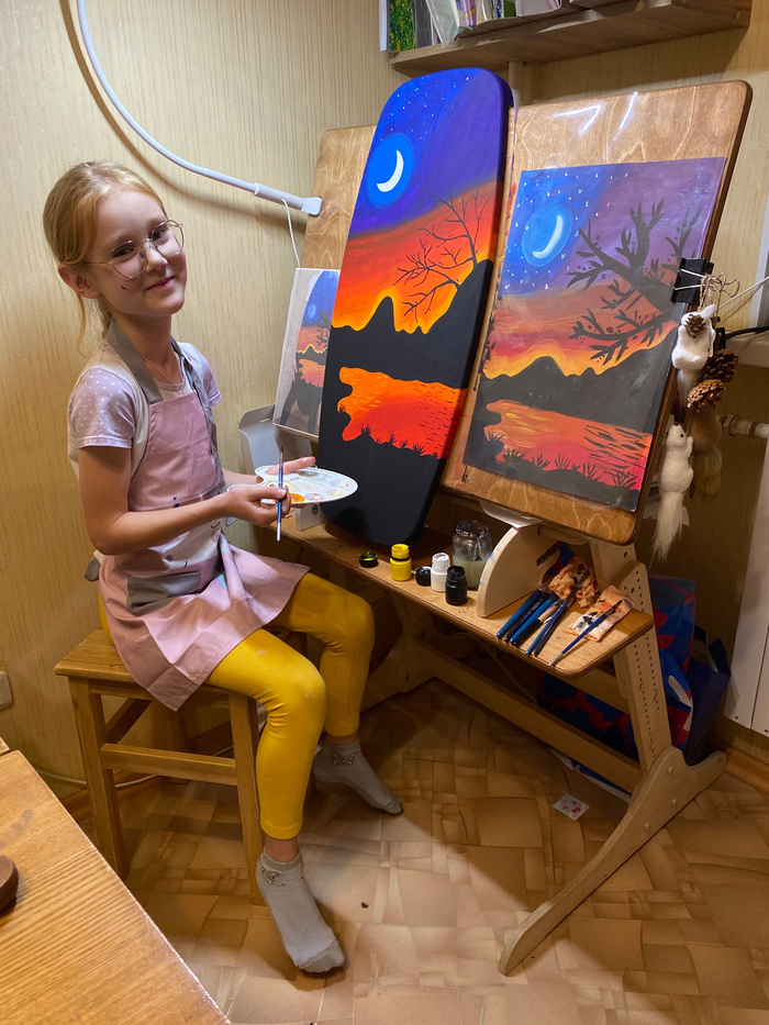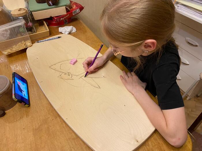 C каждого борда Оля получает от 2 до 2,5 тысяч в зависимости от того, как договоримся с заказчиком. На один рисунок уходит 2-3 вечера. Потом мама покрывает готовый борд лаком на два слоя. Всё досыхает, и борд едет к счастливому обладателю.