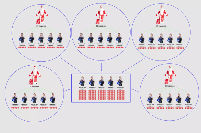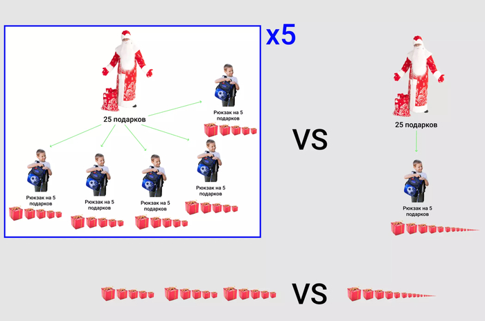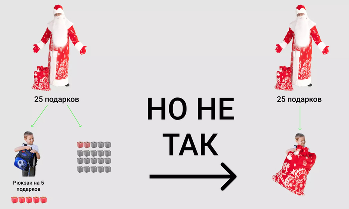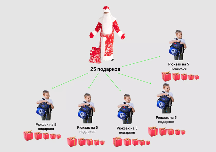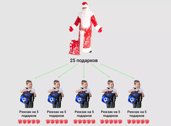 Если один ребенок захочет забрать все подарки себе, он их все равно растеряет по пути. В рюкзак вмещается 5 штук. Получается, что из 25 подарков 20 пропадут, хотя могли бы достаться другим детям.
