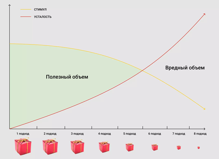 С каждым новым подходом рабочий вес и/или количество повторений будет снижаться. Следовательно, размер нашего подарка с каждым подходом будет становится все меньше.