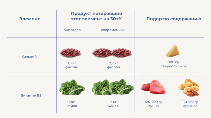 Самое нашумевшее и цитируемое исследование о потере питательности вышло еще в 2004 году. Исследователи проанализировали, как изменился состав 43 овощей и фруктов с 1950 по 1999 год. Оказалось, что концентрация 13 элементов снизилась. На разный продукт и разный элемент по разному, но в среднем от 6% на содержание белка до 38% содержания Витамина В2.