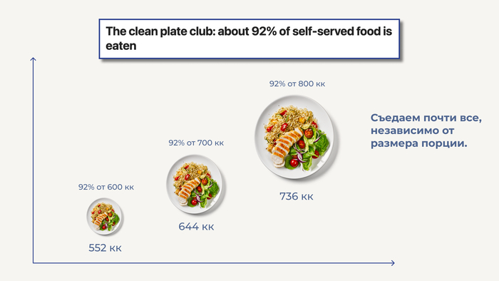 Мы съедаем около 92% пищи, независимо от того, какого размера порция была. Чем больше порция, тем больше мы съедаем.