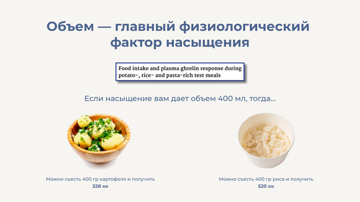 В качестве иллюстрации влияния плотности энергии можно привести еще тот факт, что при питании по ощущениям (до сытости) люди в исследовании съедали тот же объем макарон или риса, сколько и картофеля. Только в картофеле менее энергетически плотный, а, следовательно, за необходимый объем будет получено меньше калорий.