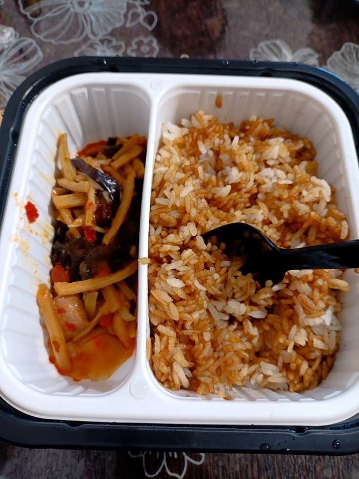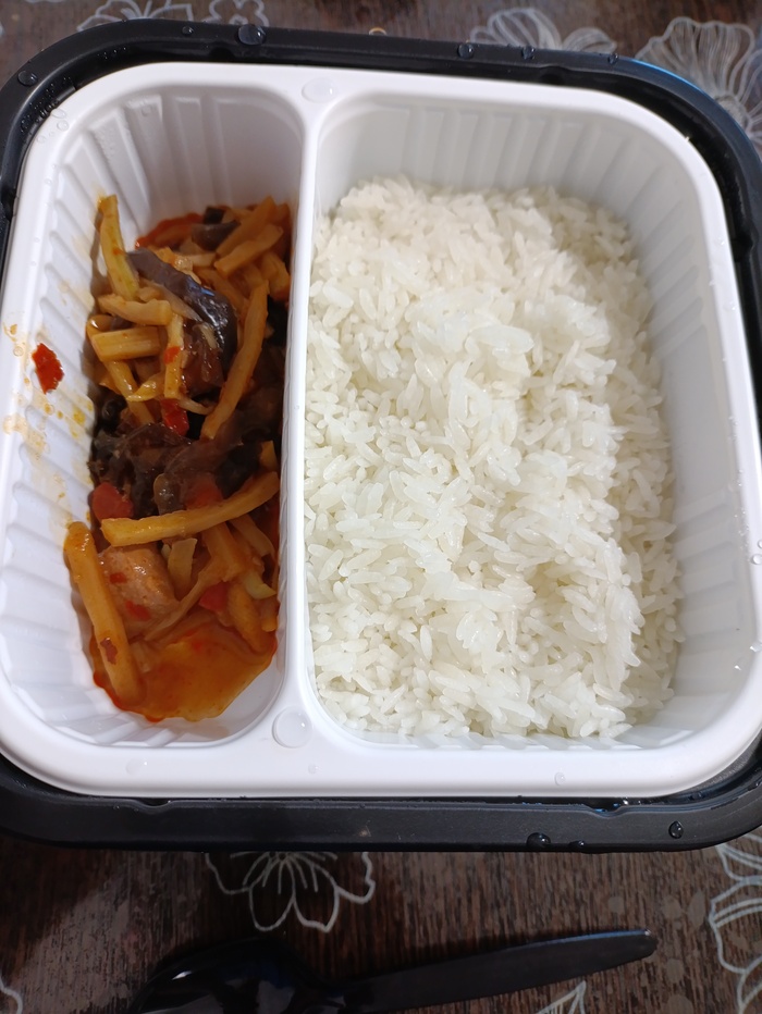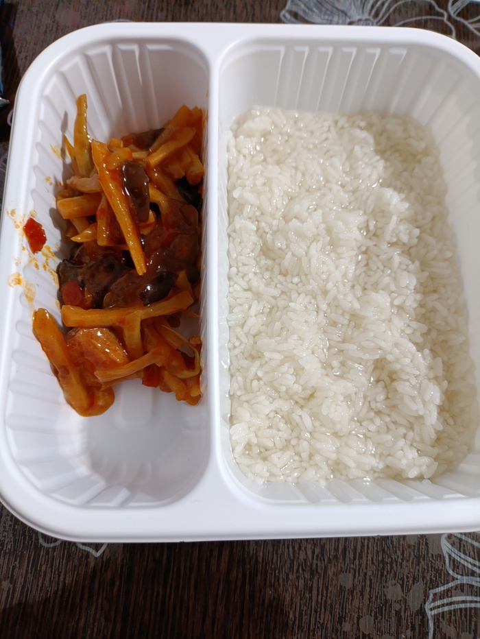 Рис получился достаточно сухой и рассыпчатый, бамбук и грибы горячие и хрустящие, мяса три небольших кусочка. Остроты не почувствовал вовсе.