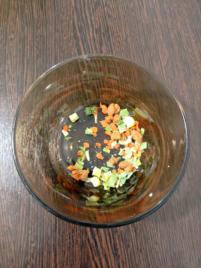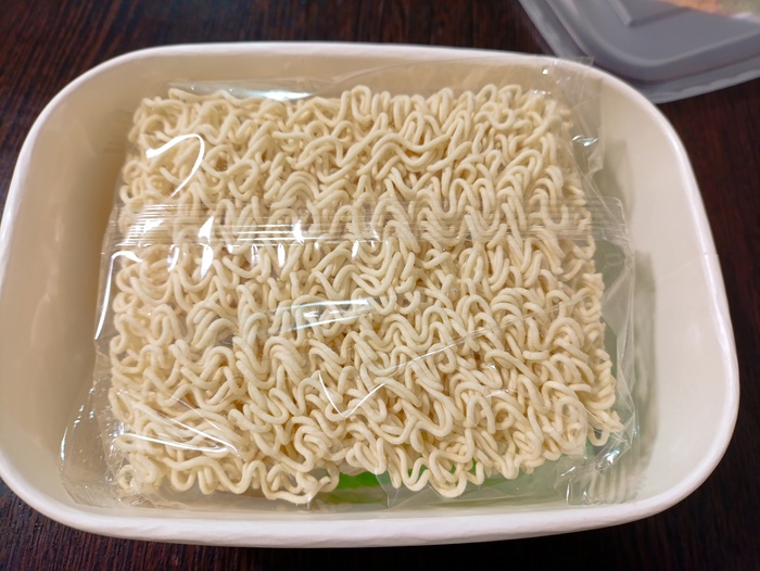 Лапша не сушёная, а уже готовая и вакуумирования, требуется лишь отварить в 500 гр воды пару минут, слить и, оставив несколько ложек жидкости, добавить суровую основу и перемешать.