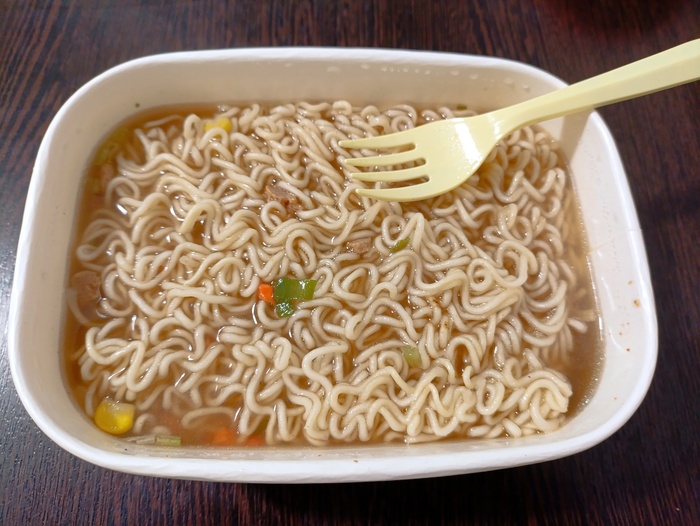 Лапша не развалилась, упругая и приятная на вкус. Бульон получился коричневый и порядочно острый, ничем особенным не выделяется. По остроте напоминает красный дошик.
