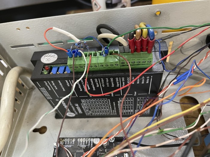 Это хитрый драйвер от ледшайна- DM805-AI, который может в аналоговый вход, так как в то время, когда я это городил, библиотек, подобных SmoothStepper еще не было, а что я мог тогда нагородить меня не устраивало, сильно проще просто рулить величиной аналогового выхода, а уж пусть сам драйвер скорость контролирует.