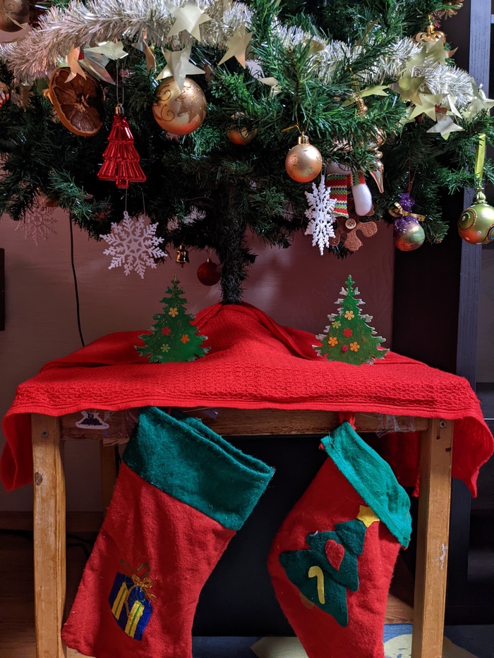 Смотрю на некоторые фотографии Ёлка + кошка, а ёлка спокойно стоит на подставке на полу. Как? Как??? Мои кошки всегда стараются на нее залезть, уронить, охотятся на игрушки.. придумала такую тему: ёлочку на стол, ножки на скотч. Знаю, ещё некоторые к потолку прикручивают. Стало интересно, как вообще разные люди решают эту проблему? Что вы придумали в этой неравной войне за дерево?