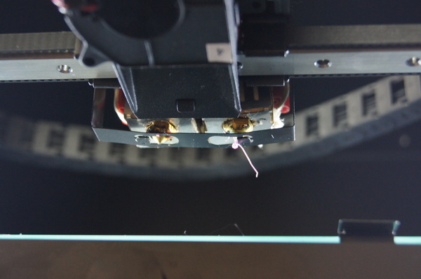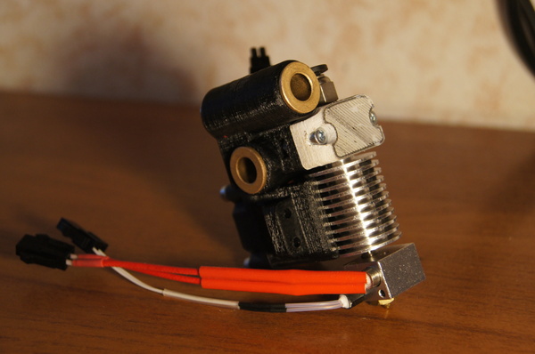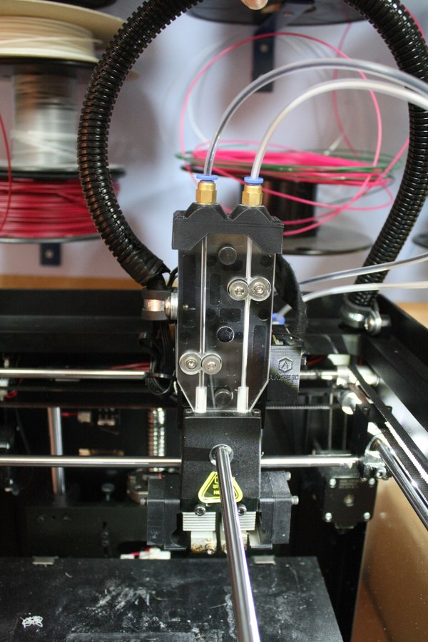 Хотэнд представляет собой два нагревательных элемента, закрепленных на одном радиаторе, а оси сопла расположены под небольши углом друг относительно друга. И при смене пластика, весь хот энд наклоняется. Под соплами расположена пластинка с прорезями, неактивное сопло упирается в нее, что предотвращает самовытекание пластика.