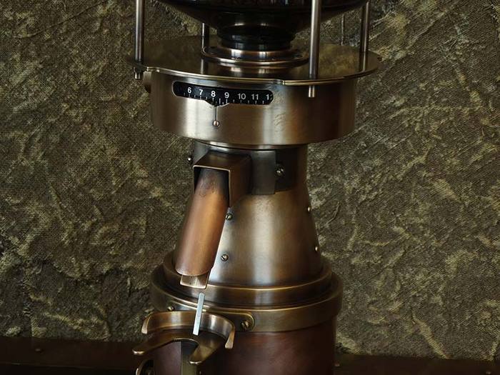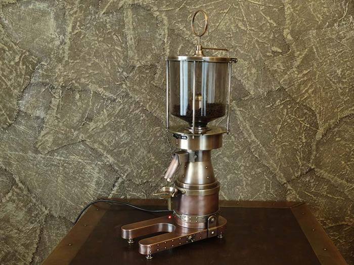 Эту кофемолку прямого помола я переделал из бункерной. Всю проводку сделал по новой, добавил механизм регулировки помола, выключатели заменил на тумблер корабельного типа со щелчком. Пластик, естественно, заменил латунью и медью.