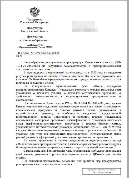 Итак, 12 июня 2025 года в небольшом городке должна была состояться ярмарка местных производителей, ответственный фонд предпринимательства, госконтора, что должна поддерживать предпринимателей и производителей... Публикуют списки участников. И что же я вижу? В качестве продавцов косметики, мыла, духов, одежды и прочих товаров подпадающих под №487-ФЗ от 31.12.2017 и №488-ФЗ от 25.12.2018 участвуют самозанятые. А как известно, самозанятые не могут производить подавать маркированный товар, более того, продажа маркированного товара без кассы запрещена.