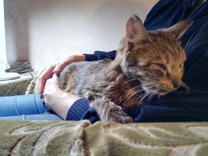 За все время стало понятно, что кошка абсолютно дикая, с людьми дела не имевшая. Очень повезло, что она не агрессивная. Но эмоции выражать еще учится, а то в виде просьбы поесть\погладить\поиграть, у она умеет только делать долгий пристальный взгляд, и вцепляться лапой в ногу сидящего.