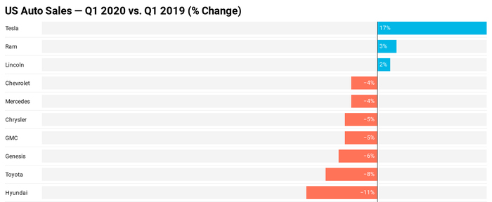 Одним из последних итогов для крупнейшего автомобильного рынка мира (США) является повсеместная тенденция падения продаж. Продажи автомобилей в США в 1-м квартале 2020 снизились на 496 000 единиц по сравнению с 1-м кварталом 2019 года.