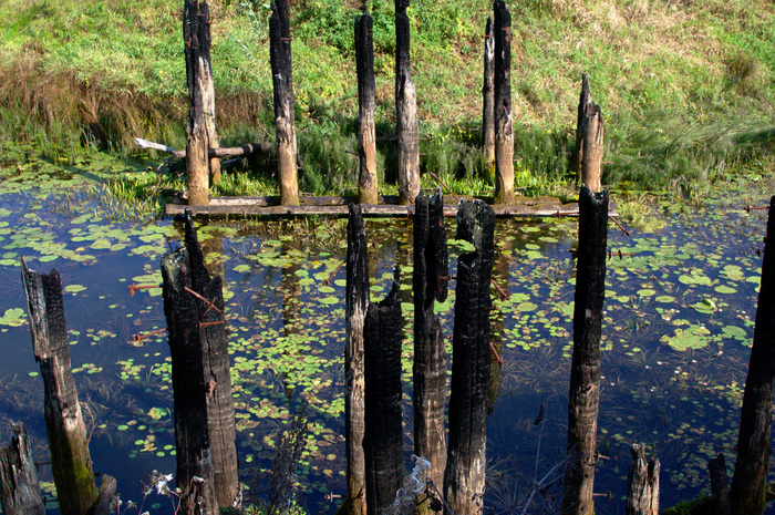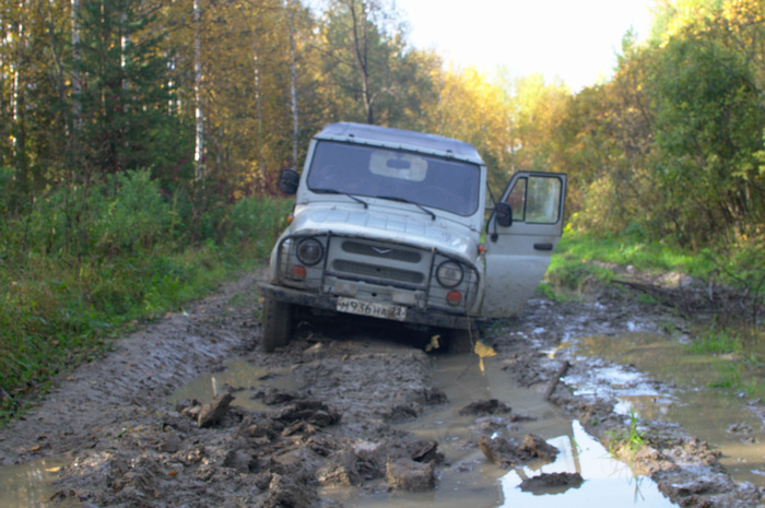 Срезаю соседний куст и набрасываю с большим запасом. Уаз проходит легко и просто, к четырем часам подкачиваю обратно колеса и еду дальше. Дорога замечательная, тянется вдоль реки мимо столбика-не-болей, огибает небольшое озеро. Идем весело, выключаю передний мост для экономии. Машина глохнет пару раз, перестает заводиться и это странно. Кончается бензин, что тоже странно. Заливаю канистру нз, пытаясь представить, сколько должно уйти, если пару дней непрерывно газовать в грязи. Вроде должно много, но не 60 же литров; подозреваю что много выкапало, но что-то тоже перебор.