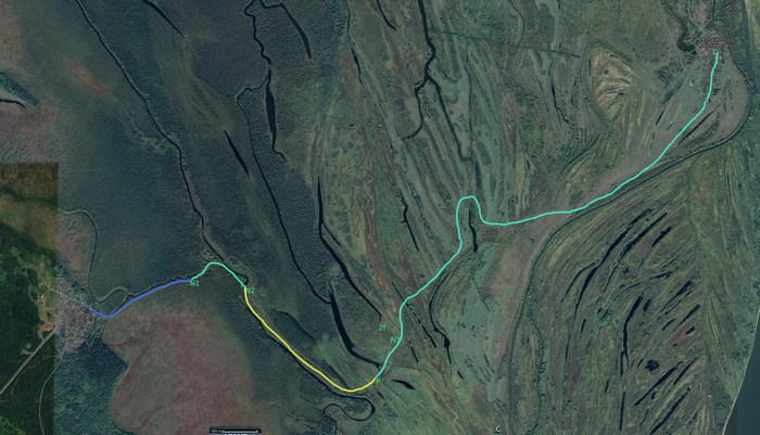 Интересовала меня область, начинающаяся в 35 км от моего дома. А дом у меня, это Шегарский район Томской области. Где-то из этих проток Оби я покупал у местных щук. Разными цветами на карте отмечены разные дни, на метки ссылки дальше. Видел я эту область только из гуглокарт, слышал о местности мало и было очень интересно, что же там происходит.